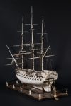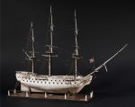 EXCEPTIONELLE MAQUETTE DE TROIS-MÂTS, ANGLETERRE, ENTRE 1791 ET 1815. Maquette réalisée en os dite " modèle de Ponton ", mécanisme de sortie et de retrait des canons en bronze, à sec de toile.