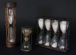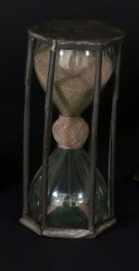 SABLIER, FRANCE, XVIIe siècle. Sablier en métal, composé de deux bases hexagonales, fiole en verre soufflé formée de deux ampoules pyriformes reliées entre-elles par un nœud couvert de fils, contient un sable jaune.