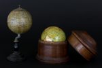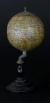 GLOBE TERRESTRE MINIATURE LEBÈGUE, PARIS, FIN XIXe siècle. Carton et papier polychrome avec 12 fuseaux, piétement en bois tourné noir. Globe signé : " JL & Cie, Paris ",