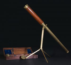 LUNETTE DE MARINE, SIGNEE GILBERT & Co, ANGLETERRE, FIN XIXe siècle Longue-vue en laiton à quatre tirages, sur trépied pliant, corps plaqué de bois verni, signée : " Gilbert & co " London / Leadl Street / Best Improved.