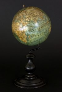 GLOBE TERRESTRE J[AN]FELKL, PRAGUE, CIRCA 1880. Globe en carton et papier polychrome verni, monture polaire inclinée, piétement en bois tourné peint en noir. Porte l'inscription suivante : " DIE ERDE, Heransgegeben von J. Flekl. Prag., v. Otto...
