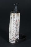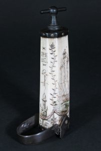 POIRE À POUDRE, ANGLETERRE, XIXe siècle. Corps en ivoire marin (morse), armature en fanon de baleine, de forme oblongue, avec incisé en noir l'inscription : " HMS / ASTA / 1826 ", corps ornementé d'un phare, d'un voilier, d'une ancre, d'une...