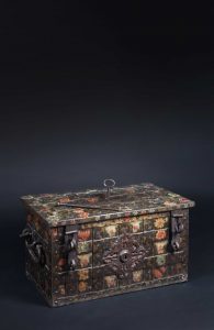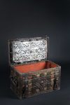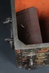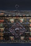 COFFRE DIT DE MARINE OU DE CORSAIRE. Fer forgé et peint. Façade ornée de paysages avec maison, église, fleurs dans un entourage de rinceaux feuillagés ; importante fausse entrée de serrure en fer découpé et gravé ; faces latérales munies...