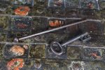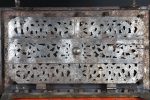 tige permettant de pousser un rivet laissant apparaître la serrure ouvrant à dix pênes sous le couvercle avec grande plaque décorative en fer découpé et gravé représentant sur six panneaux des têtes d'angelots, sirènes et oiseaux fabuleux.