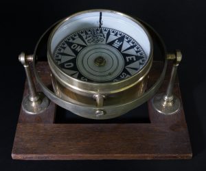 COMPAS DE MARINE, XXe siècle Compas en laiton, monté " à la cardan ", sur socle en bois, non signé. En bon état. Diam. : 16 cm. H. avec socle : 17 cm. Socle : 30 × 22 cm.
