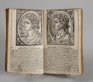 Recueil de 158 portraits d'Empereurs romains, allant de Jules César à Léopold. Chaque page contient un portrait sur bois de l'Empereur, avec une courte notice biographique dans la moitié inférieure.