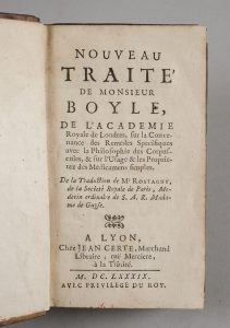 BOYLE (Robert). Nouveau traité sur la Convenance des Remèdes Spécifiques avec la Philosophie des Corpuscules et sur l'Usage et les Propriétez des Médicamens simples. Lyon. Jean Certe. 1689.
