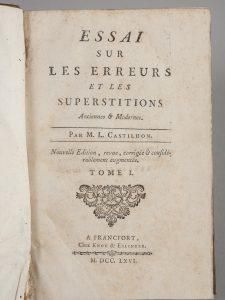 CASTILHON (Jean-Louis). Essai sur les erreurs et les superstitions anciennes et modernes. Francfort. Knoe et Eslinger. 1766.