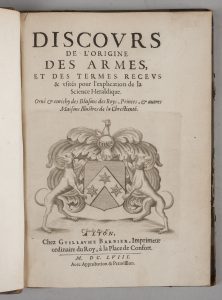 [LE LABOUREUR (Claude)]. Discours de l'origine des armes et des termes receus et usités pour l'explication de la science héraldique... À Lyon. Chez Guillaume Barbier. 1658.