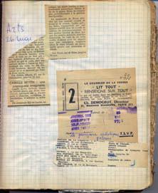coupures de presse: France au combat, 18 octobre, Arts, 9 nov. 1946. Trois coupures de presse: Arts, 26 juillet, 25 oct., Paris, 14 juin, 1952. Une revue en 3 exemplaires. Documents, n° 27, décembre. 1947. Trois coupures de presse: Combat, 5 mai, 14 nov., Arts, 31 oct. 1948. Deux coupures de presse: Arts, 23 juillet, Lundi-Dimanche, 27 juillet. 1949. Trois coupures de presse: Combat, 23 juillet, Arts, 1er juillet, Le Figaro littéraire, 2 juillet. 1951. Cinq coupures de presse: Documents, février, mai, L’Âge nouveau, juin, Daily Mail, 28 mars, L’Observateur, 22 mars. 1953. Six coupures de presse: Le Matin, 9 nov., L’écho d’Oran, 6 mai, Bibliographie de la France, 15 mai, Arts, 7 août, L’écho du Katanga, 12 sept., Arts Documents, n° 35-36. 1954. Cahier à spirales de format 21x27 cm, marqué 1954, dans lequel Bryen acollé les coupures de presse concernant son travail de mars 1954 à mai 1955 avec une incursion au 1er juin 1949. Ensemble de 70 coupures de presse. 1954. Quatre coupures de presse: Raisonnances, 1er décembre, Bibliographie de la France, 26 février, 26 nov. 1954. Revue Enjeu, n° 1, juillet. Enquête Faut-il mourir jeune? 1955. Cahier à spirales de format 21x27 cm, marqué 1955, dans lequel Bryen acollé les coupures de presse concernant son travail de mai 1955 à septembre 1956. Ensemble de 68 coupures de presse. 1955. Quarante trois coupures de presse: Arts, Gazette de Lausanne, France-Amérique, Combat, Carrefour des lettres, Frankfurter Allgemeine… 1956. Trois coupures de presse: Art News, Combat, Réforme, 25 oct. 1959. Cinq extraits du quotidien Combat ou de France-Soir. 1958. Deux coupures de presse: Combat, 17 mars, 25 mai. 1959. Quatre coupures de presse: France Soir, 7 mars, Combat, 13 mars, 25 mai, 10 août, 12 oct. 1960. Extrait de Combat, n° 60 du 4 avril. 1962. L’écho du Maroc, 17 avril. 1968. La Gazette littéraire, 31 août-1er septembre. • Article tapuscrit de Roger Bordier, romancier, critique d’art, Camille Bryen ou la volonté de poésie. 12 pages 21x27 avec corrections manuscrites. Jointe une carte de visite as. de R. Bordier à la suite de la réception de son prix Renaudot de 1961 • Article manuscrit de Marcel Bataille. Daté 27 octobre 1956, 21 mars 1957. 5 pages gr. in folio. Le temps d’une Java. Camille Bryen poète et peintre. L’ensemble des documents et coupures de presse.