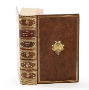 Petit in-8; veau moderne, triple filet doré en encadrement sur les plats; Armoiries centrales. Dos à nerfs orné de caissons et fleurons dorés.