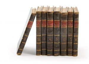 8 vol in-18 ; demi-basane verte à coins vélin, dos lisse orné de faux-nerfs dorés . AFD à froid en tête du premier plat.