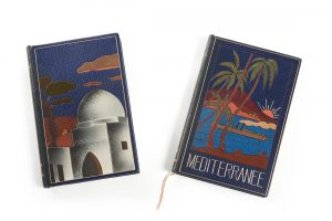 Filet doré en encadrement sur les plats. Important décor mosaïqué sur le plat (mosquée, losange multicolre sur le 2° plat. Dos lisse. Tête dorée. Large encadrement intérieur même maroquin rehaussé de 3 filets dorés. Couvertures et dos cons. Etui. Gassot].