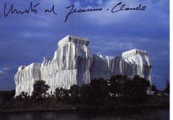 Carte postale couleurs du Reichstag emballé. Envoi couleurs de Christo et Jeanne-Claude. Joint • Christo Store fronts, empaquetages projects. Carton de la galerie der Spiegel, Köln, 1967. Envoi de Christo. • Der Reichstag Illustrations en noir.