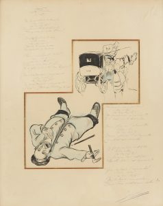 Théophile-Alexandre STEINLEN Dessin à l’encre noire avec rehauts de crayon bleu, pour illustrer un texte en vers de Léon Sandon intitulé ‘’Le Fiacre‘’.