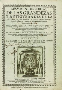 1678. (GERONA). RESUMEN HISTORIAL DE LAS GRANDEZAS Y ANTIGUEDADES DE LA CIUDAD DE GERONA Y COSAS MEMORABLES SUYAS ECLESIASTICAS, Y SECULARES, ASSI DE NUESTROS TIEMPOS COMO DE LOS PASSADOS. Barcelona : por Iacinto Andreu, 1678.
