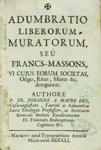1751. (MASONERIA). MATRE DEI, ADUMBRATIO [IOHANNES A ] : ADUMBRATIO LIBERORUM MURATORUM SEU FRANCS-MASSONS, VI CUJUS EORUM SOCIETAS, ORIGO, RITUS, MORES, ETC. DETEGUNTUR. Madrid : apud Typographiam Antonii Marin, 1751.