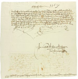 refrendado por Juan de la Parra, secretario de SS. MM. Manuscrito sobre papel, 21 x 21 cm. Firma manuscrita ´YO EL REY´, ´YO LA REYNA´.