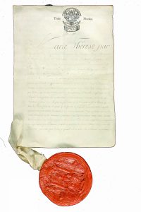 2 hojas de pergamino, con un gran sello de cera de 12 cm de diámetro dentro de una caja metálica.