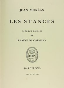 1937. (BIBLIOFILIA). MOREAS, JEAN : LES STANCES. Catorce dibujos de Ramon de Capmany. Barcelona : Montaner y Simon, 1937.