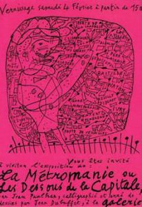 Jean Dubuffet. Affichette invitation pour La Métromanie. Affichette format sur papier pelure rose composée pour le vernissage le 4 février, 1950, de l’exposition La métromanie ou Les Dessous de la Capitale par Jean Paulhan, calligraphiée et