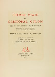 1944. (BIBLIOFILIA). CASAS, BARTOLOME DE LAS : PRIMER VIAJE DE CRISTOBAL COLON SEGÚN SU DIARIO DE A BORDO. Recogido y transcrito por... Prefacio de Gregorio Marañon. Ilustraciones originales grabadas al boj por Antonio Ollé y Pinell. Barcelona...