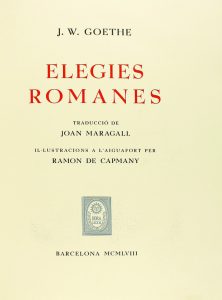 1958. (BIBLIOFILIA). GOETHE, J.W. ; CAPMANY [ilustrador] : ELEGIES ROMANES. Traducción de Joan Maragall. Barcelona-Sabadell : Hora Luen-Sallent, 1958.