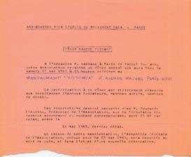 Dîner Marcel Duchamp. Invitation, ronéotypée et manuscrite pour un dîner amical à l'initiative de l'Association pour l'étude du mouvement Dada. Restaurant Victoria, 6, av. Rachel Paris Xviii, le samedi 15 mai 1965. Jointe deux photos en noir de la