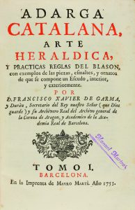 1753. (HERÁLDICA). GARMA, FRANCISCO XAVIER DE : ADARGA CATALANA, ARTE HERALDICA, Y PRACTICAS REGLAS DEL BLASON, CON EXEMPLOS DE LAS PIEZAS, ESMALTES Y ORNATOS DE QUE SE COMPONE UN ESCUDO, INTERIOR, O EXTERIORMENTE. Barcelona : en la imprenta de...