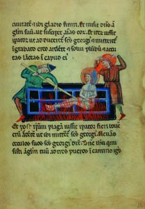 Imitación pergamino con abundantes ilustraciones miniadas. Enc. en plena piel con cierres.
