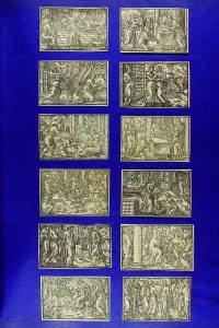 Meticulosamente ordenados : motivos florales, motivos vegetales, escenas bíblicas (muchas de ellas identificadas con leyendas), colección de Papas desde San Pedro a Clemente (identificados)...