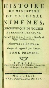 1746. (INQUISICION). MARSOLIER : HISTOIRE DU MINISTERE DU CARDINAL XIMENES, ARCHEVESQUE DE TOLEDE ET REGENT D´ESPAGNE. Paris : chez Chardon, 1744.