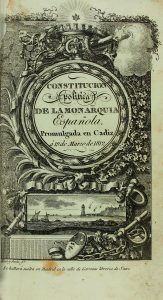 Precioso grabado en la portada, con el título en medallón y debajo vista del puerto de Cádiz, sigue el DISCURSO PRELIMINAR LEÍDO EN LAS CORTES 120 p. + 7 h. + texto de la constitución 120 p., 1 h.