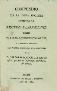 1814. (HISTORIA). CONDORCET, MARQUES DE : COMPENDIO DE LA OBRA INGLESA INTITULADA RIQUEZA DE LAS NACIONES. Traducido al castellano con varias adiciones del original por Carlos MARTINEZ DE IRUJO. Palma : Imp. De Miguel Domingo, 1814.