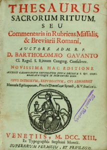 1713. (RELIGION). GAVANTO, BARTHOLOMAEO : THESAURUS SACRORUM RITUUM, SEU COMMENTARIA IN RUBRICAS MISSALIS, & BREVIARII ROMANI. Venetiis [Venecia] : Typ. Stephani Monti, 1713.