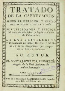 1784. (DERECHO). TOS Y URGELLES, JAIME : TRATADO DE LA CABREVACION SEGUN EL DERECHO, Y ESTILO DEL PRINCIPADO DE CATALUÑA. Sus utilidades, y efectos, del modo de principar, y seguir las causas de cabrevación. DE LOS PRIVILEGIOS, y pretensiones...
