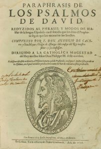 1616. (BIBLIA-POESIA). CACERES Y SOTO MAYOR, ANTONIO : PARAPHRASIS DE LOS PSALMOS DE DAVID : REDUZIDOS AL PHRASIS Y MODOS DE HABLAR DE LA LENGUA ESPAÑOLA... Lisboa : Imp. Pedro Crasbeeck, 1616.