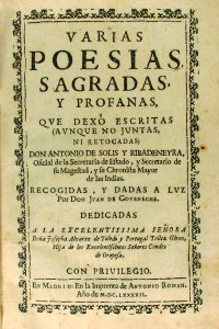1692. SOLIS RIVADENEYRA, ANTONIO : VARIAS POESIAS SAGRADAS, Y PROFANAS, que dexó escritas, aunque no juntas ni retocadas don… Recogidas y dadas a luz por don Juan de Goyeneche. Madrid : Antonio Román, 1692.