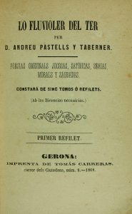 1868. (LITERATURA-BRUGALLA). PASTELLS Y TABERNER, ANDREU : LO FLUVIOLER DEL TER. POESÍAS ORIGINALS JOCOSAS, SATÍRICAS, SERIAS, MORALS Y SAGRADAS. Dedicatoria y prólogo. Gerona : Imprenta De Tomás Carreras, 1868.