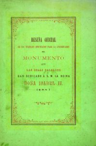 1864. (MALLORCA-URBANISMO EFÍMERO). RESEÑA OFICIAL DE LOS TRABAJOS EFECTUADOS PARA LA CONSTRUCCIÓN DEL MONUMENTO QUE LAS ISLAS BALEARES HAN DEDICADO A S.M. LA REINA DOÑA ISABEL II. [+ 4 LITOGRAFIAS ORIGINALES SOBRE EL EVENTO]. Palma : ...