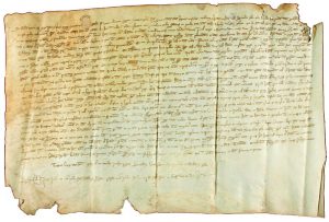 1318. (CORRO DE DALT). PERE BROU Y SU MUJER SANCIA, DE LA PARROQUIA DE SANT MAMET DE CORRO DE DALT, VENDEN A BERNAT SALA, TAMBIEN DE CORRO, UN CAMPO LLAMADO ´TRIA´, BAJO DOMINIO DEL REY. Manuscrito sobre pergamino,