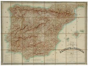 Bello mapa de España y Portugal en colores, sobre tela, preservado en su estuche original.