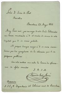 • a una carta fechada en Barcelona el 23 de mayo de 1853, dirigida por Francisco Font y Romá (gentilhombre de cámara de S.M.) a Juan de Prat y Zea Bermudez, cónsul de España en Marsella.
