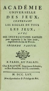 1765. (JUEGOS). ACADÉMIE UNIVERSELLE DES JEUX CONTENANT LES RÈGLES DE TOUS LES JEUX, AVEC INSTRUCTIONS FACILES POUR APPRENDRE À LES BIEN JOUER, augmentée du Jeu de Whisk. Paris : chez Leclerc, 1765.
