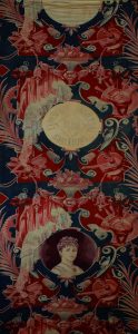 Panel decorativo en tejido damasco 205 x 86 cm buen estado de conservación a excepción de una sutil mancha en el rostro de la Reina.