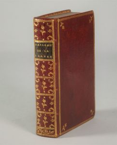 Soit 2 tomes reliés en un vol. petit in-12 ; maroquin rouge, triple filet doré en encadrement sur les plats, dos lisse orné, filets sur les coupes, tranches dorées, roulette intérieure.
