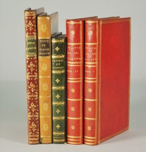 2 volumes in-12 ; maroquin rouge, triple filet doré en encadrement sur les plats. Dos lisse orné de faux-nerfs dorés. Médailons dorés. Roulete sur les coupes. Tranches dorées.