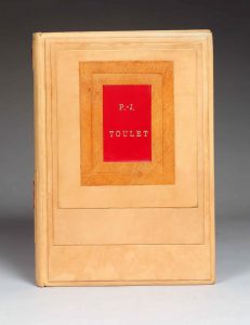 Grand In-8, reliure plein veau beige mosaïquée, dos lisse portant le titre frappé en rouge en long et deux pièces mosaïquées, plats ornés de compositions mosaïquées à empiècement rouge et citron portant les noms de l'auteur et de l'illustrateur, tête dorée, couverture et dos conservés [Demercière].
