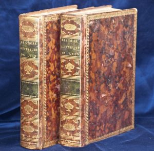 Bibliographie - Colonia (Père). Histoire Litteraire De La Ville De Lyon avec une bibliothèque des auteurs sacrés et profanes. Lyon, Rigollet 1728-30. 2 volumes in-4°, basane porphyre, dentelle dorée sur les plats, dos lisse très orné (reliure du
