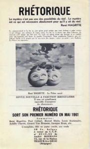 [René Magritte]. Rhétorique. Tilleur-lez-Liège, directeur: André Bosmans. In-12 ou in-16, agrafés ou broché (n° 3). N° 1 à 13, mai 1961 à février 1966. Collection complète de cette revue illustrée par René Magritte. Certains numéros de la